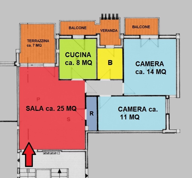 L'immobile è composto da salone, cucina abitabile, due camere da letto, bagno, ripostiglio, terrazzina, veranda, due balconi e posto auto.